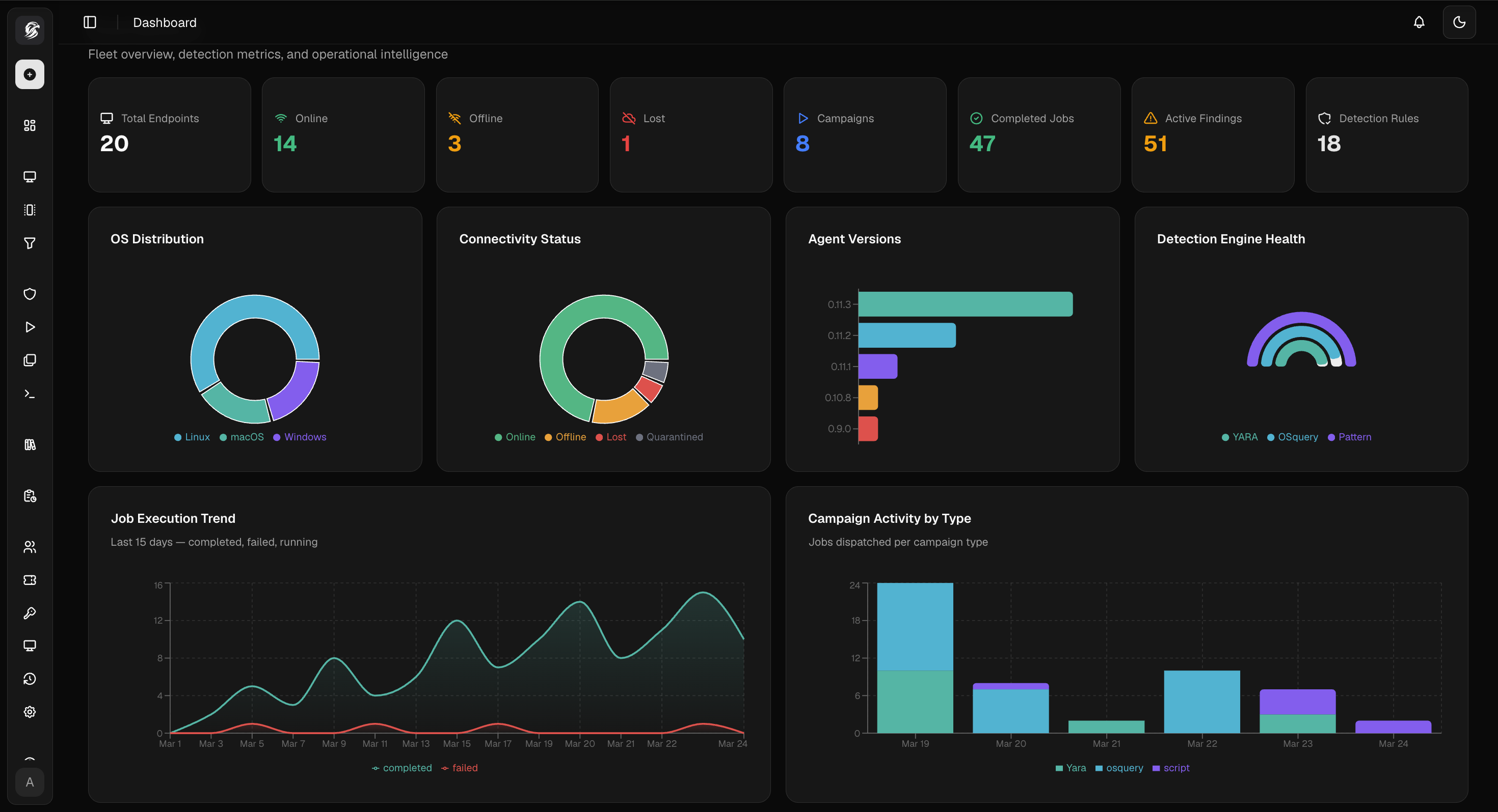 Run YARA, Sigma, and osquery campaigns across the fleet. Monitor findings with MITRE ATT&CK mapping and severity-based triage from a single dashboard.
